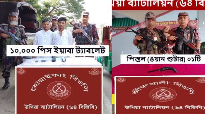 ৬৪ বিজিবি’র পৃথক দুটি অভিযানে ১টি অস্ত্র ও ১০ হাজার ইয়াবা ২জন আসামী আটক